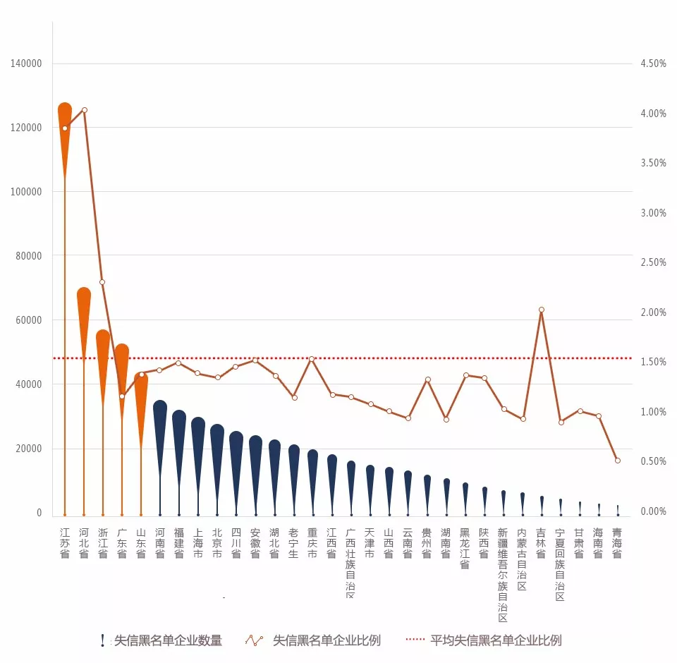 | 江蘇、河北、浙江失信黑名單企業(yè)量/比例均位于前列 |