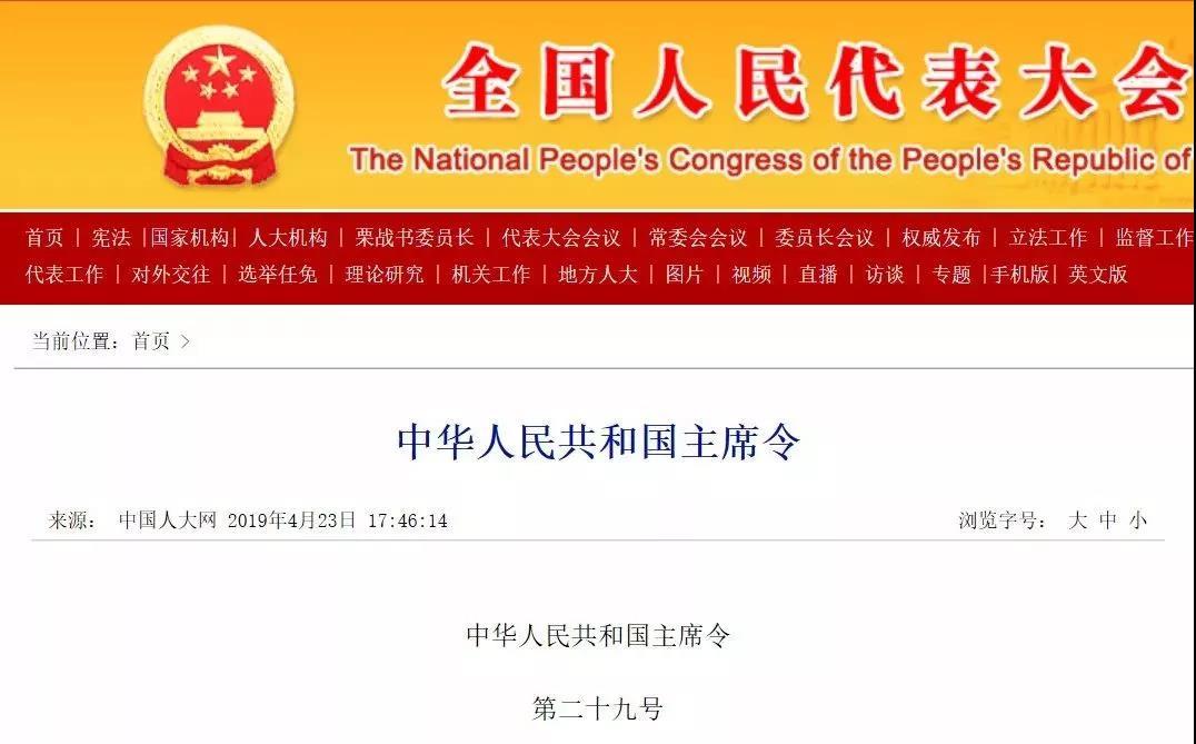 4月23日,全國人民代表大會頒布中華人民共和國主席令(第二十九號 ),修改《建筑法》《消防法》等八部法律,除《商標法》外,其他法律的修改條款自本決定公布之日起施行。