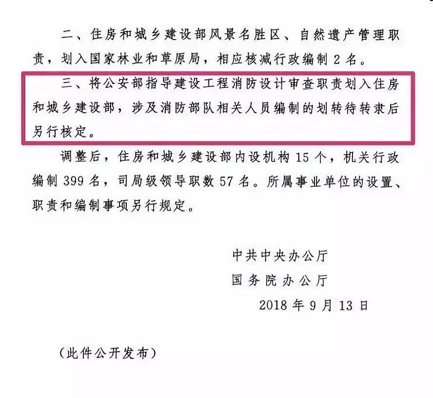 2018年9月13日,中央辦公廳正式發(fā)文(廳字2018第58號),將公安部指導建設工程消防設計審查職責劃入住房和城鄉(xiāng)建設部,涉及消防部隊相關(guān)人員編制的劃轉(zhuǎn)待轉(zhuǎn)隸后另行核定。
