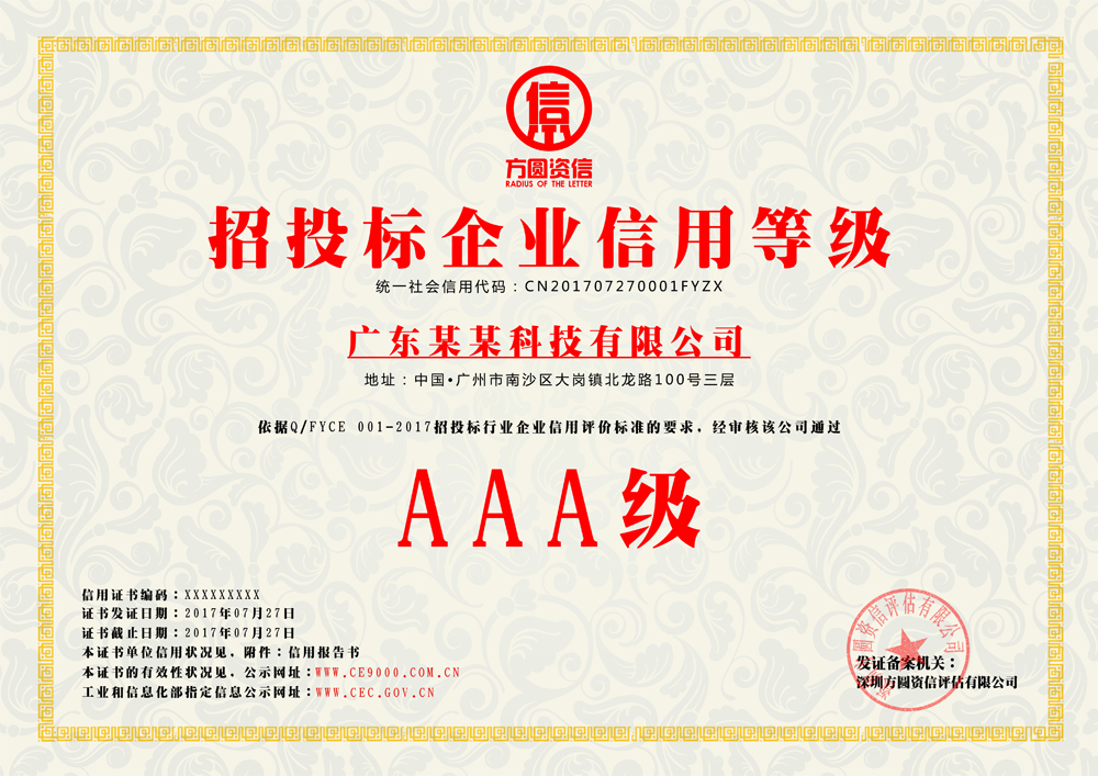 2016年,由深圳方圓資信評估有限公司組織,國家高級信用管理師帶領的一批專業的信用評估師團隊,制訂了《招投標行業企業信用評價標準》,同年,在深圳標準研究院通過備案(標準號:Q/FY CE001-2017)。